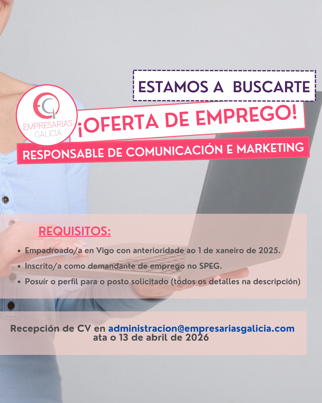Oferta de Emprego Tes experiencia en comunicación, márketing e xestión administrativa? Localización: Vigo Tipo de contrato: Indefinido, tempo completo Responsabilidades